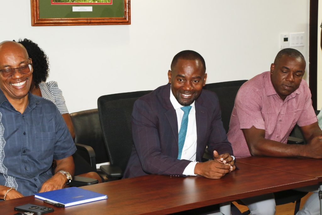 Bottom – New Minister of Transport and Works Kirk Humphrey, Permanent Secretary Jehu Wiltshire and Minister of State in the Ministry Dr. Romel Springer meeting with senior staff of MTW at the Ministry’s offices at the Goddard Building, Haggatt Hall, St. Michael (Photo by W. Murray MTW)