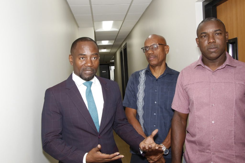 Top – New Minister of Transport and Works Kirk Humphrey, Permanent Secretary Jehu Wiltshire and Minister of State in the Ministry Dr. Romel Springer speaking to the media on Minister Humphrey’s first day on the job.(Photo by W. Murray MTW)